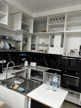 Большая гостиная, совмещенная с кухней, где можно посидеть большой компанией на столом. Есть раскладывающийся диван. дополнительная раскладушка.