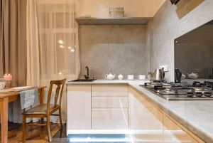 полностью оборудованная кухня (варочная поверхность, холодильник, микроволновая печь, вся необходимая посуда и столовые приборы);