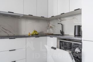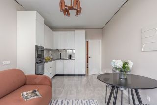 - Гостевая кухня-гостиная - стильный кухонный гарнитур, диван, обеденный столик на четверых. Вся необходимая техника, включая посудомойку и холодильник.
