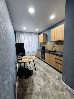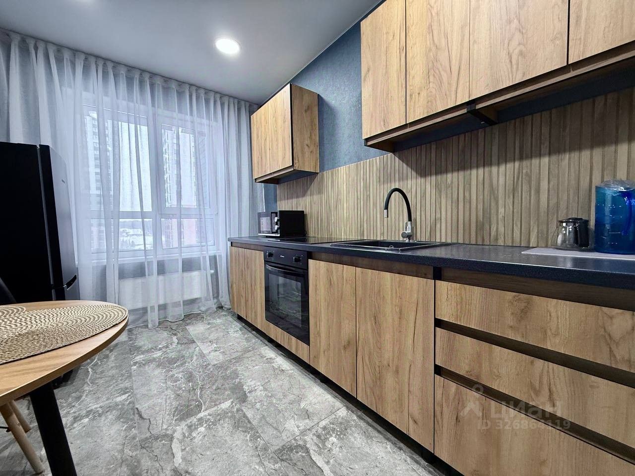 Стильный кухонный гарнитур, оснащён варочной панелью, духовым шкафом, а также имеется микроволновая печь, электрический чайник, двухкамерный холодильник и стиральная машина;