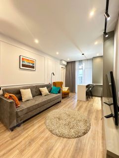В квартире сделан дизайнерский ремонт, который подчёркивает её стиль и уют. В комнатах есть мебель, поэтому вам не придётся беспокоиться о дополнительных затратах на обстановку. Кухня оборудована всей необходимой техникой: кондиционер, холодильник, посудомоечная машина, телевизор и стиральная машина, что делает проживание максимально комфортным. В ванной комнате установлена ванна.