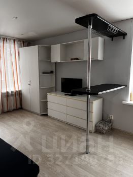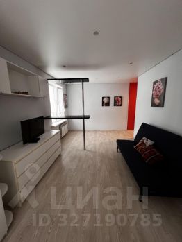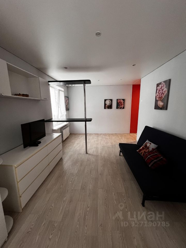 В гостиной установлен телевизор и шкафы для хранения вещей. Из мебели также имеются удобные диван и кровать.