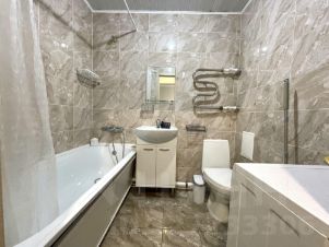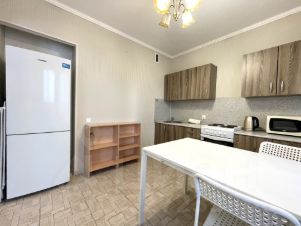 Квартира с современным ремонтом и полностью обставлена мебелью. В кухне площадью 7 кв. м есть всё необходимое: холодильник и мебель, чтобы комфортно готовить и принимать пищу. В комнате — мебель для отдыха и сна, а также телевизор. В совмещённом санузле установлена ванна и стиральная машина, что обеспечивает удобство в быту.