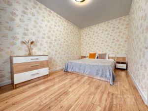 - Полностью укомплектована мебелью: диван, большая двуспальная кровать размера 160200, гардеробная.