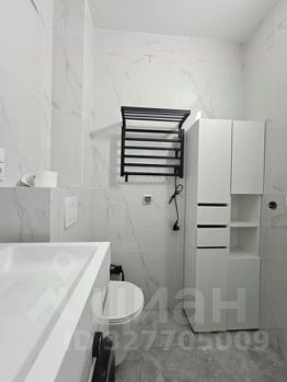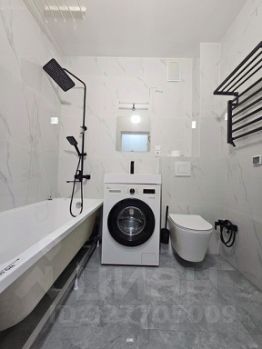 В ванной комнате установлена инсталляция, большая ванная, стиральная машина и зеркало, так же есть места для хранения бытовой химии.