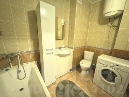 Вместительная кухня в приятных тонах, из кухни выход на остекленную лоджию. Санузел совмещенный, просторный, включает стиральную машину и водонагреватель на случай сезонного отключения горячей воды.
