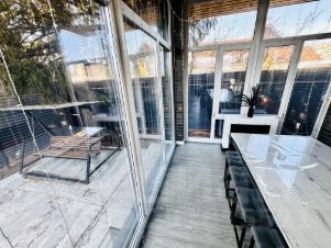 Большая теплая терраса с панорамными окнами, диваном, камином и столом на 20 персон (сервировочная посуда).