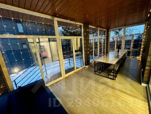 Просторная терраса с панорамным остеклением и теплым полом, где размещается банкетный стол на 20 персон и стулья к нему, а также большой комфортный диван.