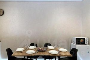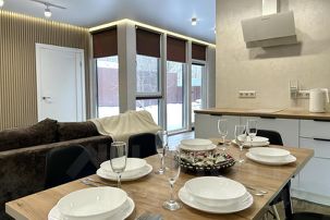 кухня с обеденной зоной и посудой