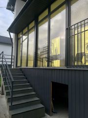 На первом этаже просторная кухня-гостиная, комната отдыха с электрической сауной, утеплённая веранда и гостевой санузел.