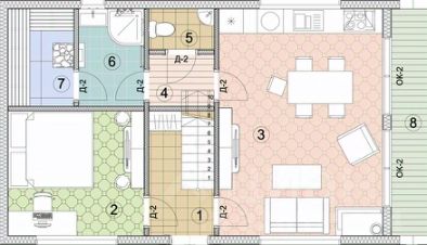 На 1 этаже: спальня 10,2 м2, кухня-гостиная 22,3 м2, раздельный санузел, сауна.