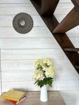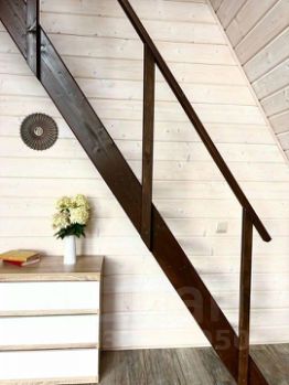 На первом этаже расположена кухня-гостиная и санузел, на втором — спальня.