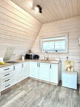 Варочная панель, раковина, холодильник, микроволновая печь, эл. Чайник, кастрюли и сковородка, посуда и приборы на 4-х персон.