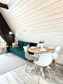 Диван-кровать (в разложенном виде дополнительные 2 спальных места), телевизор со Смарт-ТВ и Wi-Fi, игровая приставка консоль(фанатам ретро игр наверняка понравится возможность вернуться в видеоигровой мир 90-х.), обеденный стол со стульями.