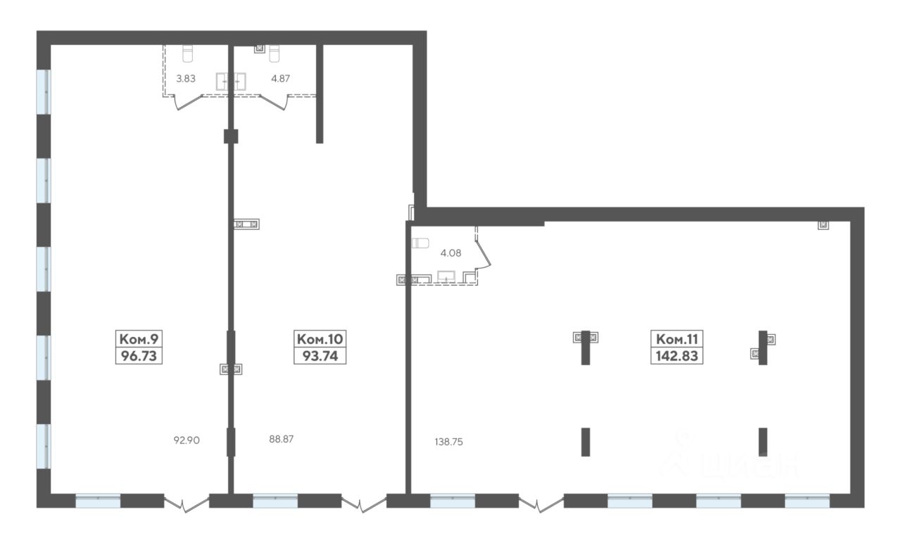 Площадь помещения: 96,34 кв.м., свободная планировка.
