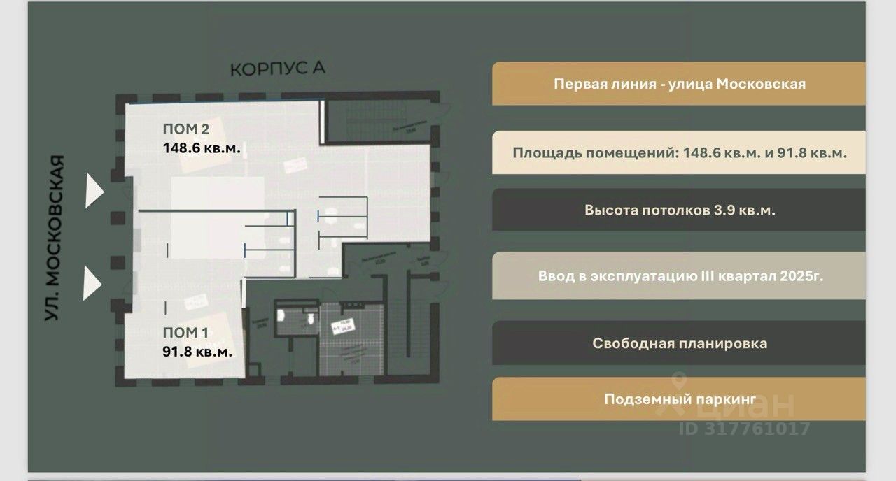 - Площадь: 91,8 м² (в продаже 2 смежных помещения с отдельными входами, общая площадь — 240,4 м²).