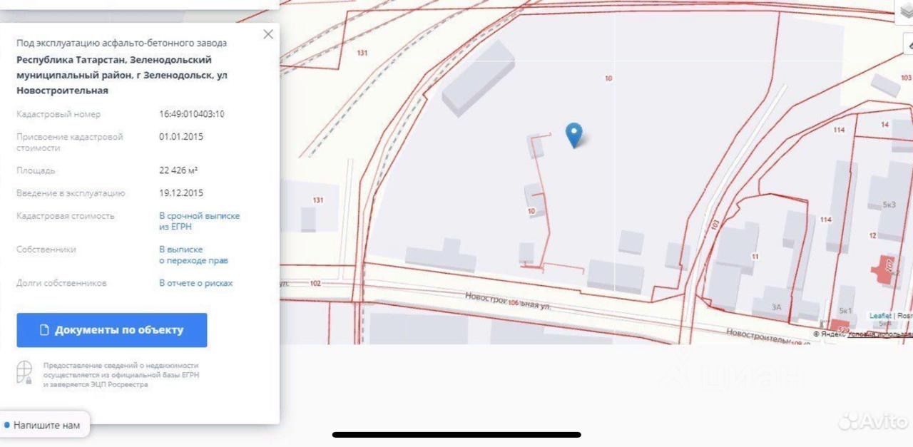 Земельный участок площадью 22426 кв метров. Кадастровый номер 16:49:010403:10 расположенный по адресу РТ г. Зеленодольск ул. Новостроительная, принадлежащий ООО бывший Асфальто-бетонный завод ИНН 1648011011. На данном земельном участке в собственности имеется: Административное здание, трансформаторная подстанция, газораспределительный пункт, котельная, железнодорожный тупик. Газ 2700 куб метров, при необходимости до 6000 куб метров. Электричество 100 кВт. Цена 150 млн руб.