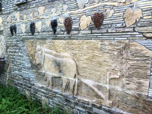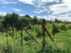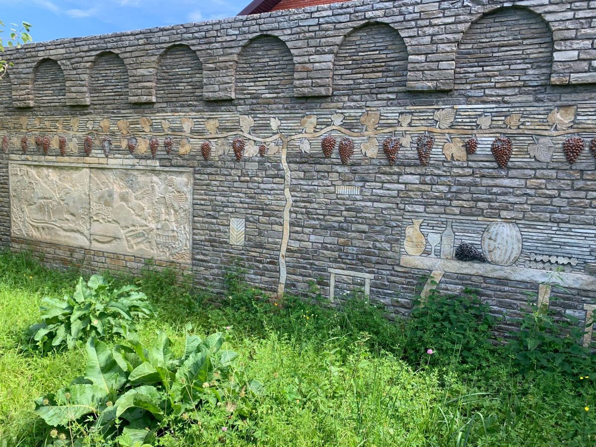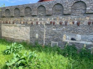 Земельный участок (40 соток ИЖС) с редкими сортами винограда, сортовыми плодово-ягодными насаждениями огорожен высоким забором ручной работы из натурального камня с вазонами и барельефами.