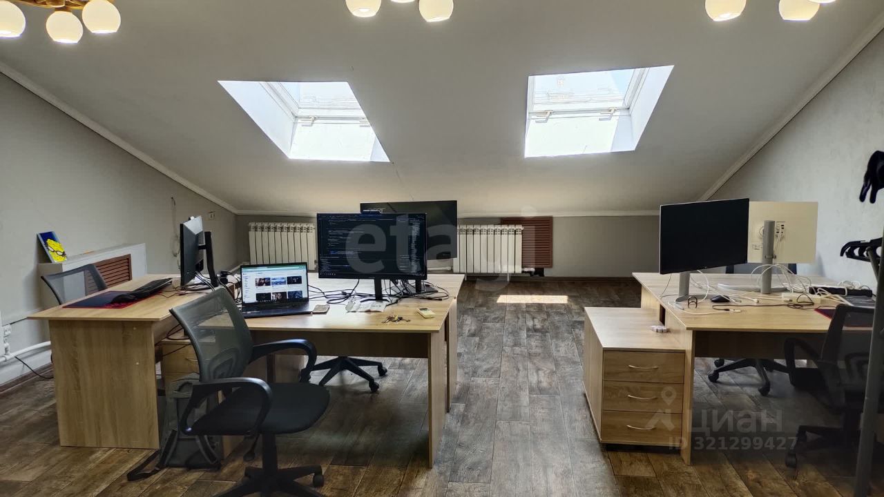 Главный кабинет 43 м² с мансардными окнами (естественное освещение).