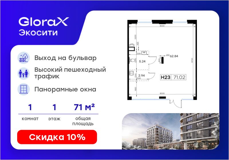 Прoдаeтся помeщeние - 71,02 кв.м. в проектe GlоraХ Экосити.