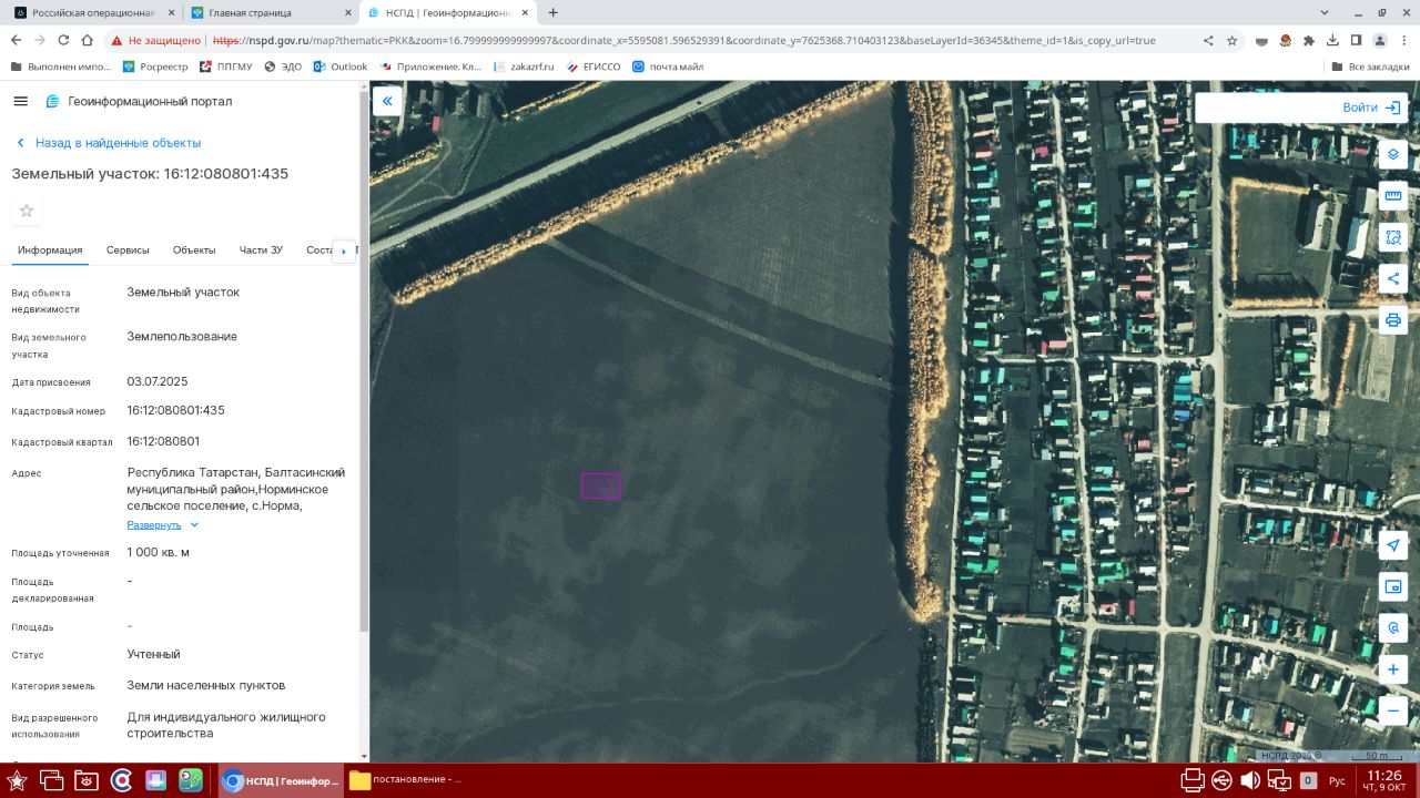 Категория земель: земли населенных пунктов, разрешенное использование: для индивидуального жилищного строительства, общая площадь 1000 кв.м, кадастровый номер 16:12:080801:435, расположенный по адресу: Республика Татарстан, Балтасинский муниципальный район, Норминское сельское поселение, с. Норма, ул. Галии Гарифуллиной, д. 20