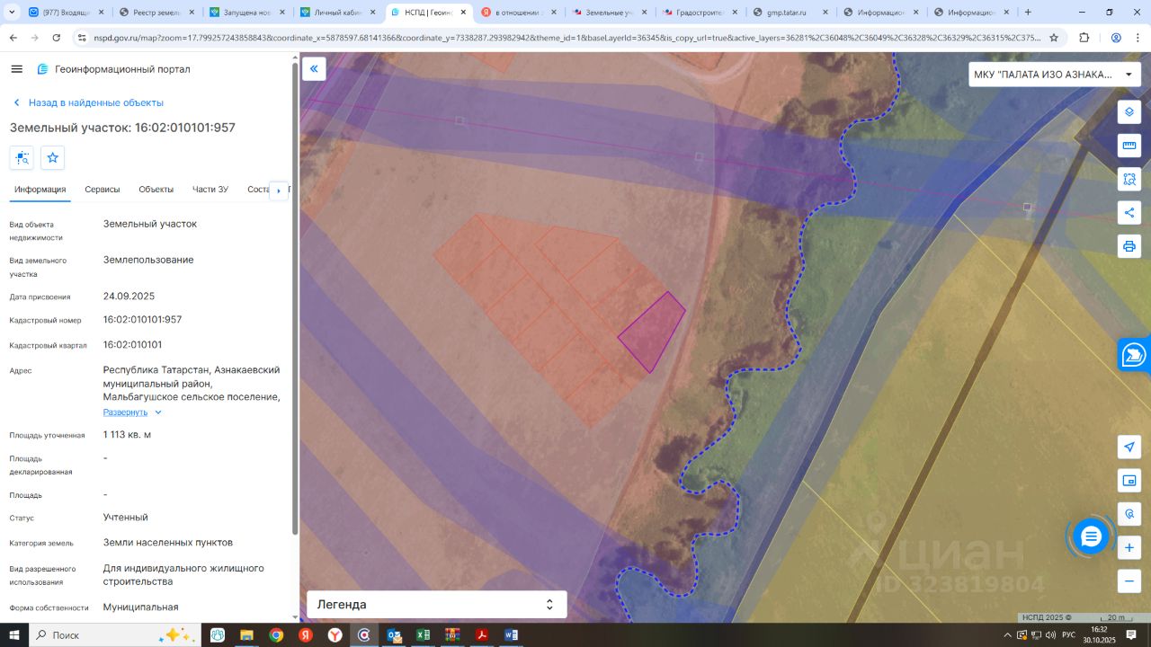 земельный участок, из состава земель населенных пунктов, для индивидуального жилищного строительства: - с кадастровым номером 16:02:010101:957, площадью 1113 (одна тысяча сто тринадцать) кв.м.,