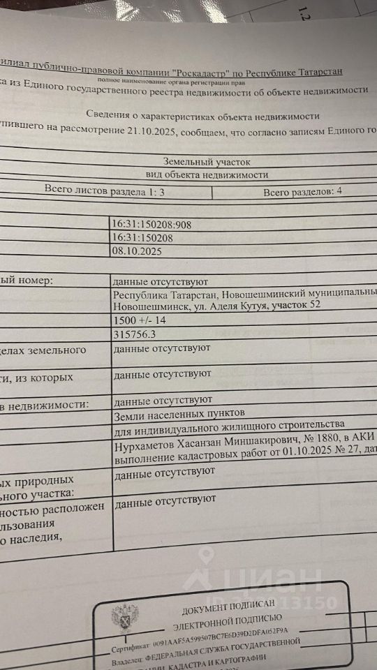 Земельный участок, категория земель: "Земли населенных пунктов" с кадастровым номером 16:31:150208:908, разрешенное использование: для индивидуального жилищного строительства, общая площадь 1500 кв.м, расположенный по адресу: Российская Федерация, Республика Татарстан, Новошешминский муниципальный район, с. Новошешминск, ул. Аделя Кутуя, участок 52 Начальная цена 321000,00 (Триста двадцать одна тысяча рублей 00 копеек)00 копеек. Шаг аукциона 9630,00 (Девять тысяч шестьсот тридцать) рублей 00 копеек.