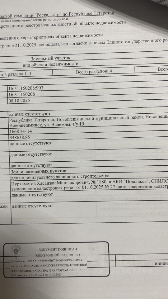 Земельный участок, категория земель: "Земли населенных пунктов" с кадастровым номером 16:31:150208:903, разрешенное использование: для индивидуального жилищного строительства, общая площадь 1668кв.м, расположенный по адресу: Российская Федерация, Республика Татарстан, Новошешминский муниципальный район, с. Новошешминск, ул. Надежды, з/у 19. Начальная цена 357000,00 копеек. Шаг аукциона 10710,00