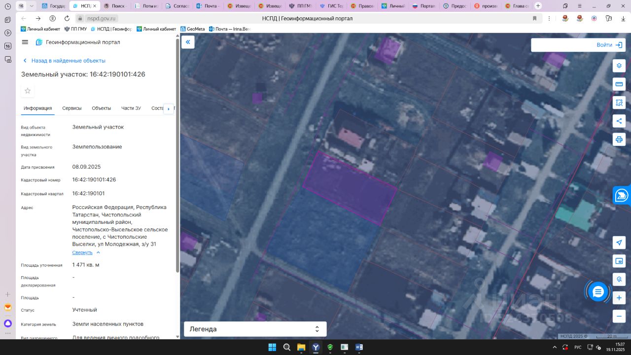 Земельный участок с кадастровым номером 16:42:190101:426 площадь 1471 по адресу Российская Федерация, Республика Татарстан, Чистопольский муниципальный район, Чистопольско-Высельское сельское поселение, с Чистопольские Выселки, ул Молодежная, з/у 31