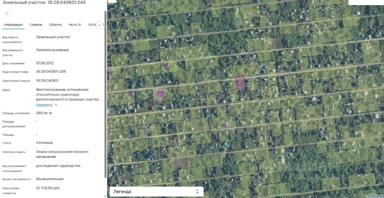 земельный участок из земель сельскохозяйственного назначения площадью 489 кв.м. с кадастровым номером 16:28:040601:249, с разрешенным использованием "для ведения садоводства", расположенный по адресу: Российская Федерация, Республика Татарстан, Мензелинский муниципальный район, Верхнетакерменское сельское поселение, тер. СНТ Наратлы, з/у 619