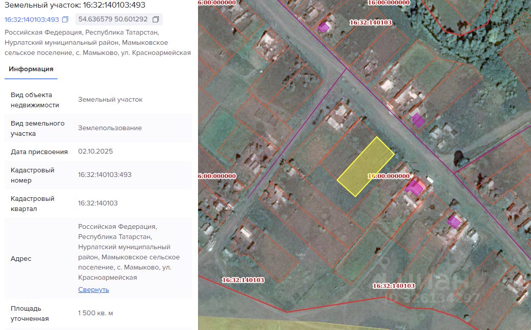Земельный участок из земель населенных пунктов с кадастровым номером 16:32:140103:493 площадью 1500 кв.м., расположенного по адресу: Российская Федерация, Республика Татарстан, Нурлатский муниципальный район, Мамыковское сельское поселение, с. Мамыково, ул. Красноармейская, с разрешенным использованием для индивидуального жилищного строительства, в собственность.