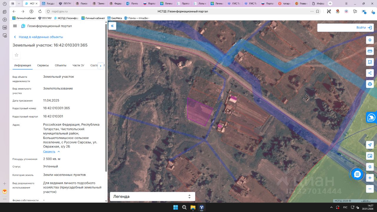 Земельный участок с кадастровым номером 16:42:010301:365 площадь 2500 по адресу Российская Федерация, Республика Татарстан, Чистопольский муниципальный район, Большетолкишское сельское поселение, с Русские Сарсазы, ул. Овражная, з/у 2Б