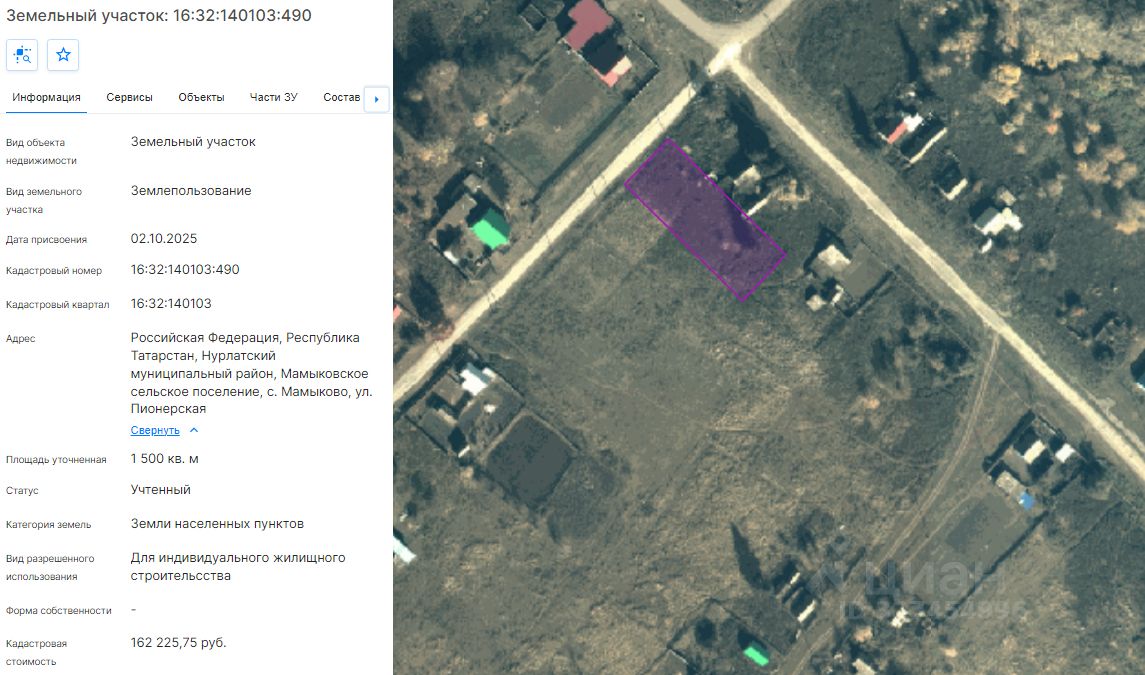 Земельный участок из земель населенных пунктов с кадастровым номером 16:32:140103:490 площадью 1500 кв.м., расположенного по адресу: Российская Федерация, Республика Татарстан, Нурлатский муниципальный район, Мамыковское сельское поселение, с. Мамыково, ул. Пионерская, с разрешенным использованием для индивидуального жилищного строительства, в собственность.