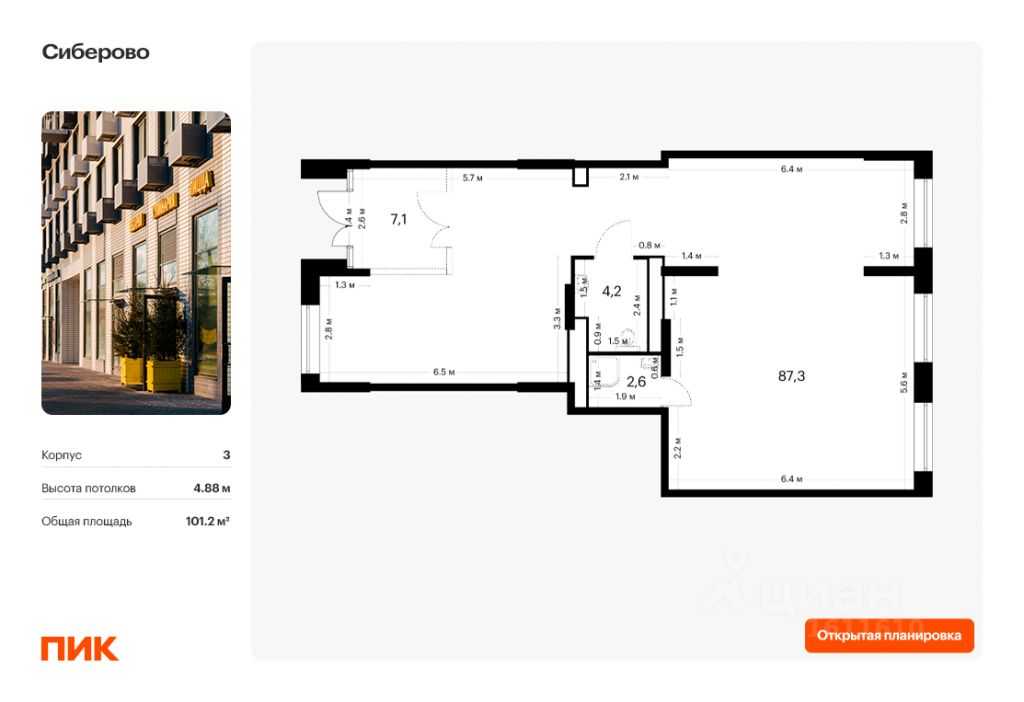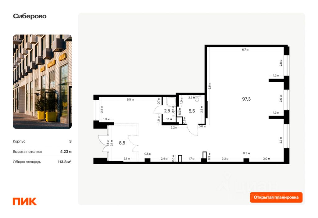 - Открытая планировка, возможно объединить несколько помещений