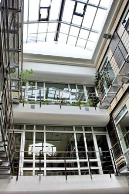 • Атриум с декоративной подсветкой, основание которого находится в холле первого этажа. На уровне второго этажа размещается зона рекреации с зимним садом. Верх атриума венчает стеклянный "купол", установленный на крыше здания.