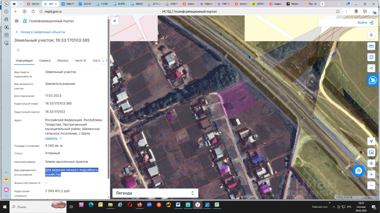 Лот 6. Земельный участок с кадастровым номером 16:33:170103:385 общей площадью 3000 кв.м., расположенный по адресу: Российская Федерация, Республика Татарстан, Пестречинский муниципальный район, Шалинское сельское поселение, с Шали. Категория Земли населенных пунктов/ разрешенное использование Для ведения личного подсобного хозяйства. Вид права собственность. Начальная цена 1 934100,00 рублей.
