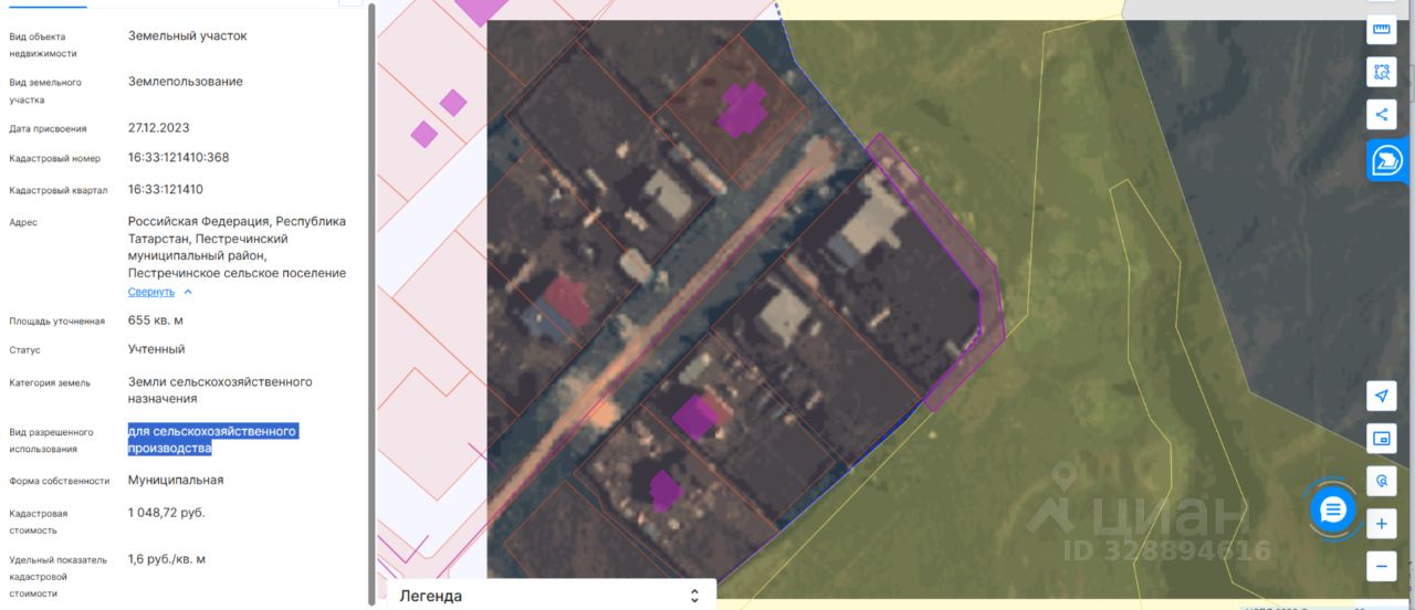 Лот 3. Земельный участок с кадастровым номером 16:33:121410:368, общей площадью 655 кв.м., расположенный по адресу: Российская Федерация, Республика Татарстан, Пестречинский муниципальный район, Пестречинское сельское поселение. Категория Земли сельскохозяйственного назначения/ разрешенное использование для сельскохозяйственного производства. Вид права собственность. Начальная цена 68000,00 рублей.