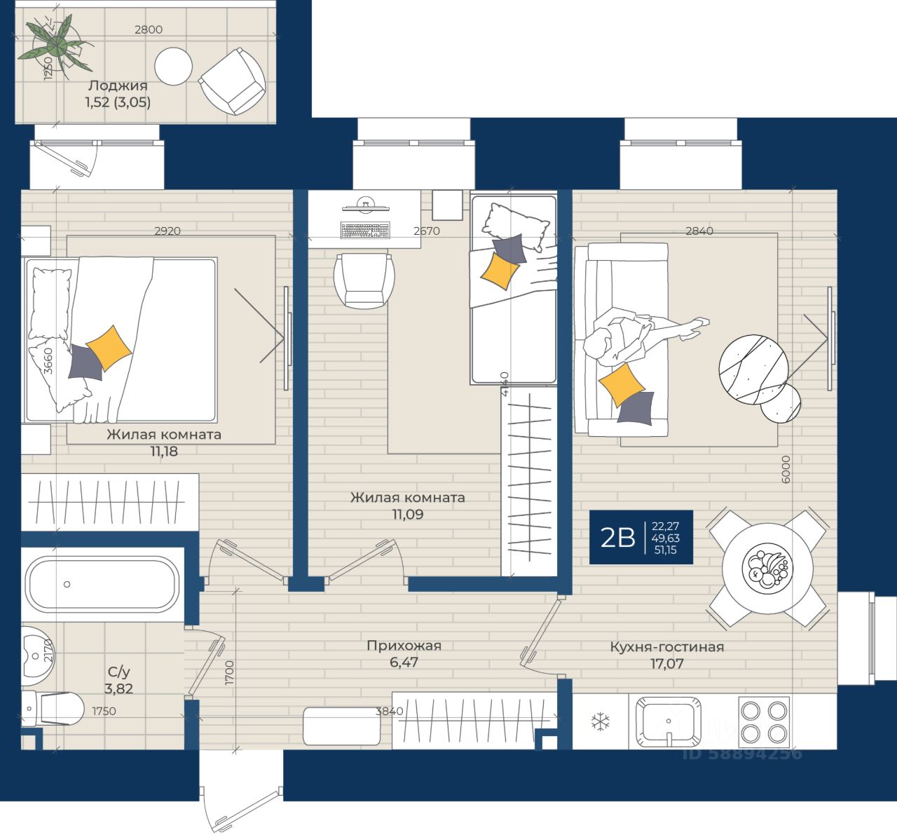 Жилой комплекс "Достояние", Квартира 76 общей площадью 51,2 м2 на 1 этаже, улица Дорожная, дом 27.