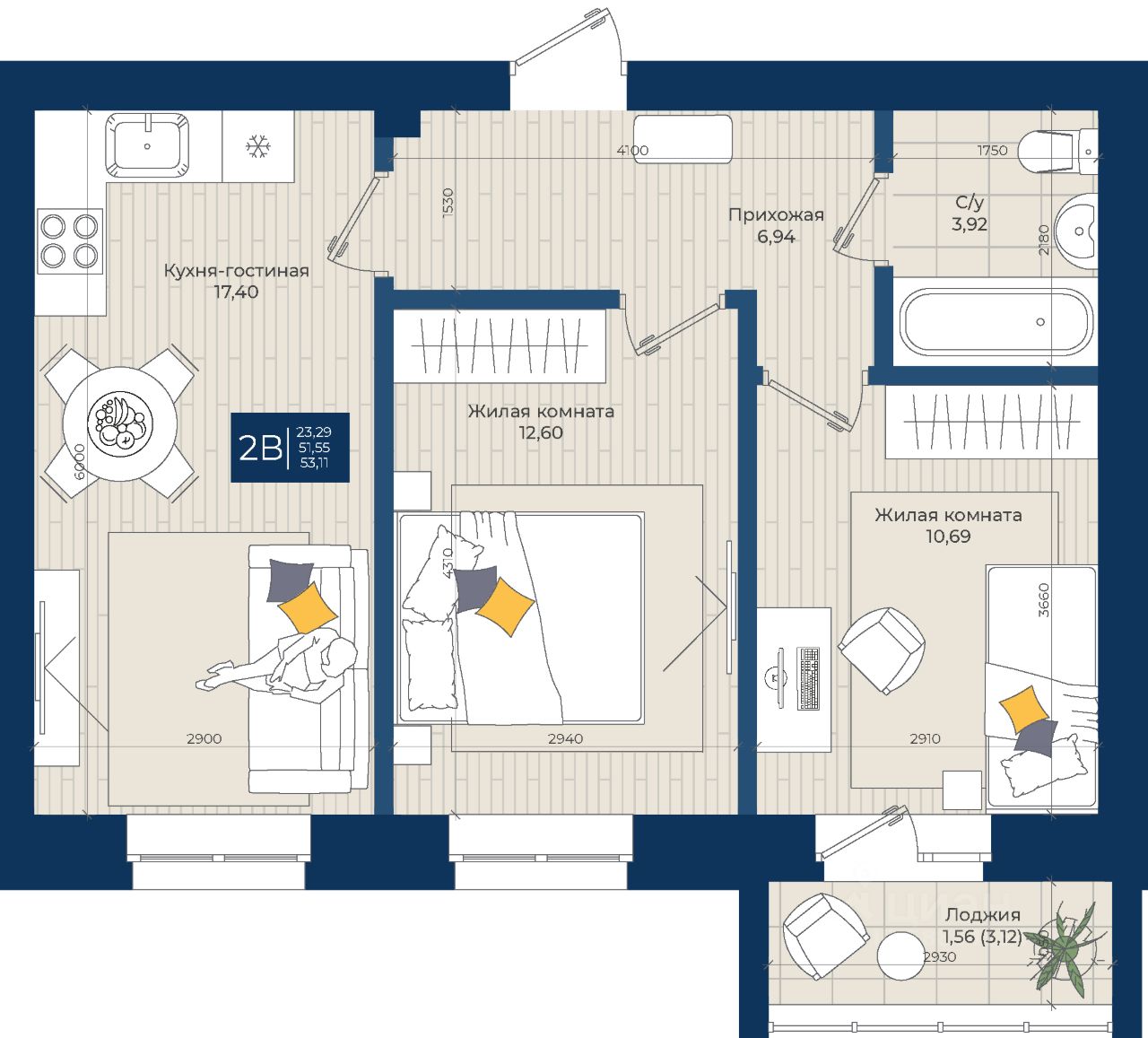 Жилой комплекс "Достояние", Квартира 84 общей площадью 53,9 м2 на 4 этаже, улица Дорожная, дом 35.
