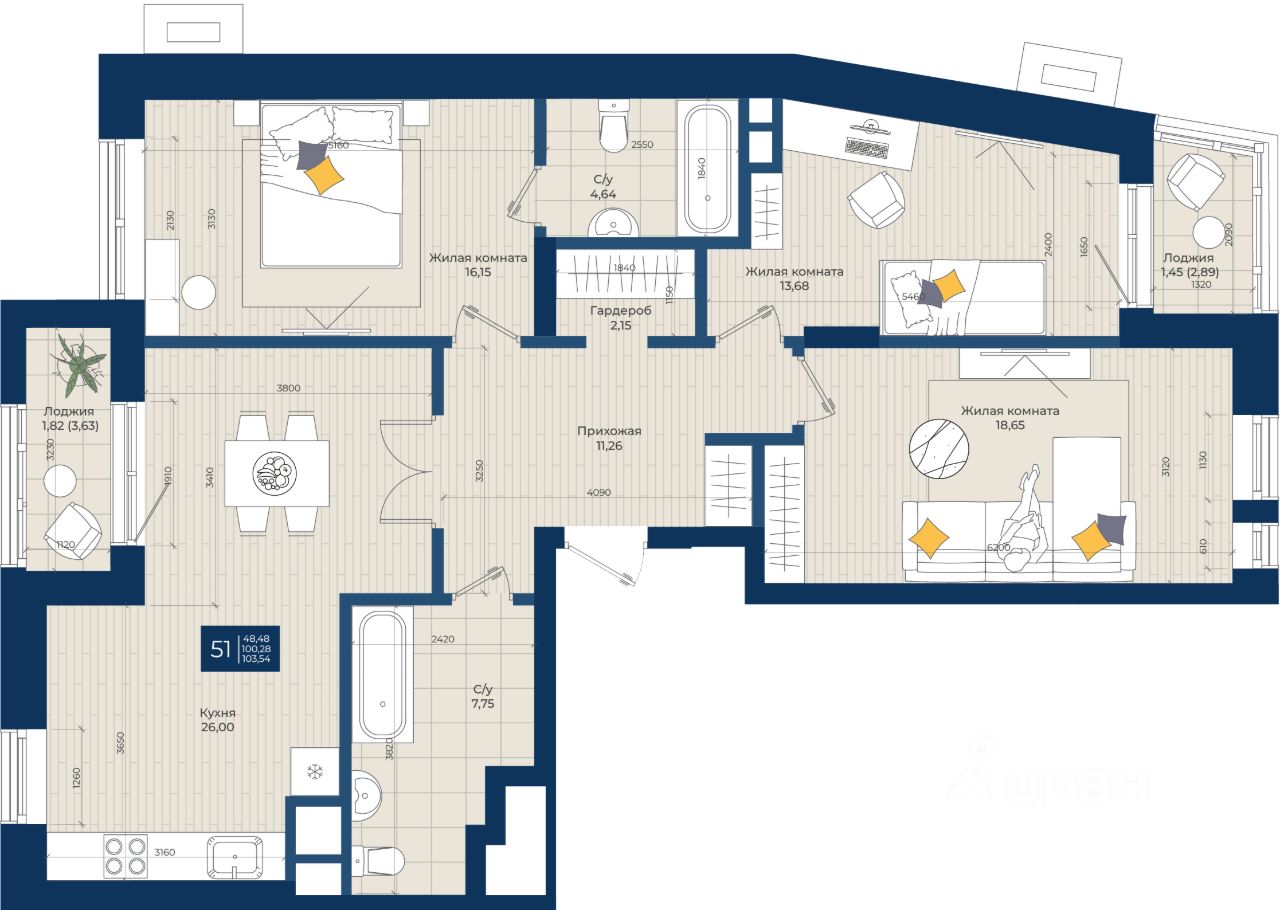 Жилой комплекс "Максат", Квартира 51 общей площадью 103,54 м2 на 2 этаже.