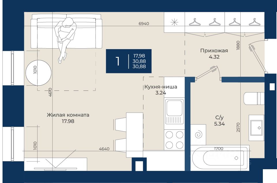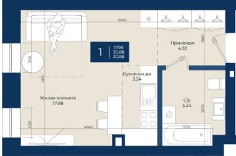 Жилой комплекс "NOVA" Квартира 3 общей площадью 30,88 м2 на 2 этаже.