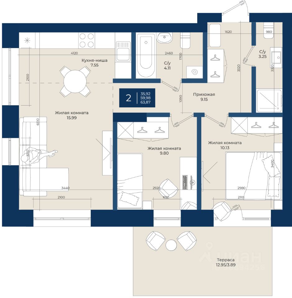 Жилой комплекс "NOVA" Квартира 2 общей площадью 63,87 м2 на 2 этаже.