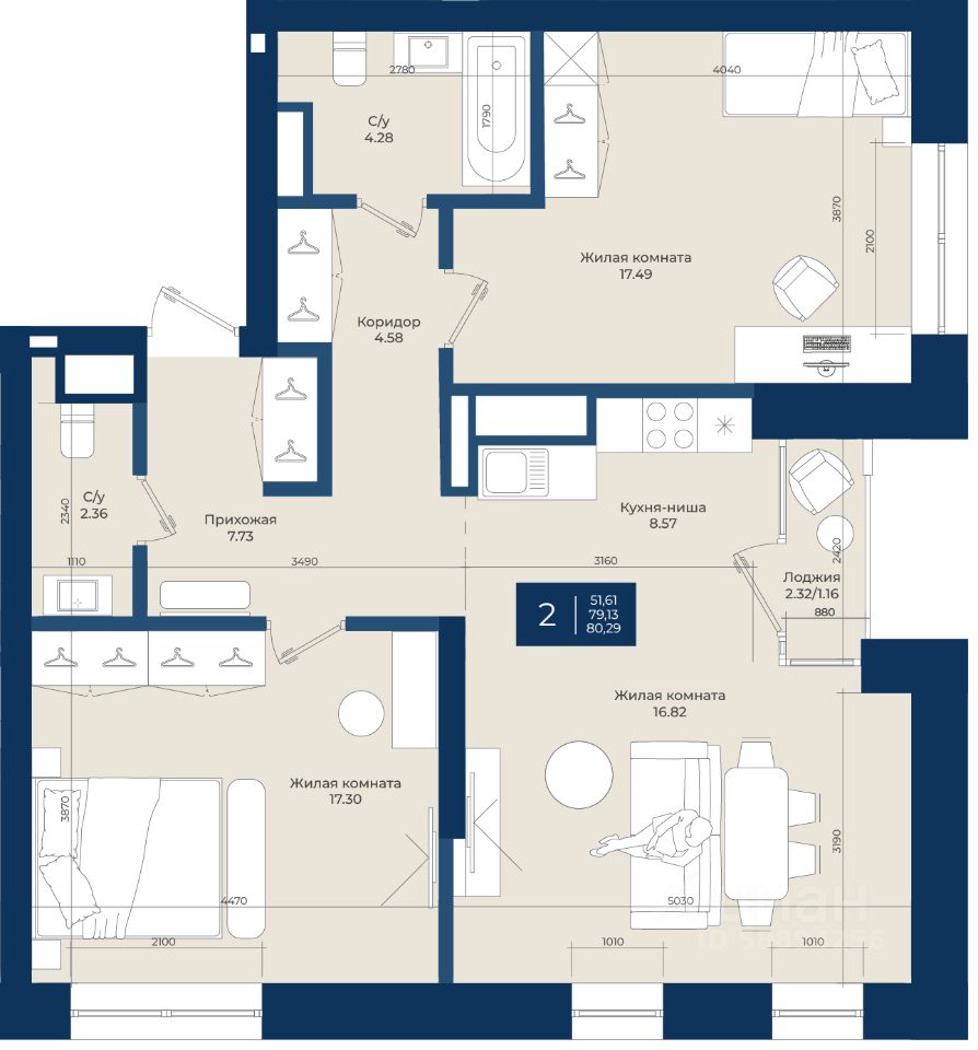 Жилой комплекс "NOVA" Квартира 56 общей площадью 80,29 м2 на 7 этаже.