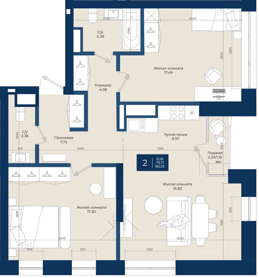 Жилой комплекс "NOVA" Квартира 66 общей площадью 80,29 м2 на 8 этаже.