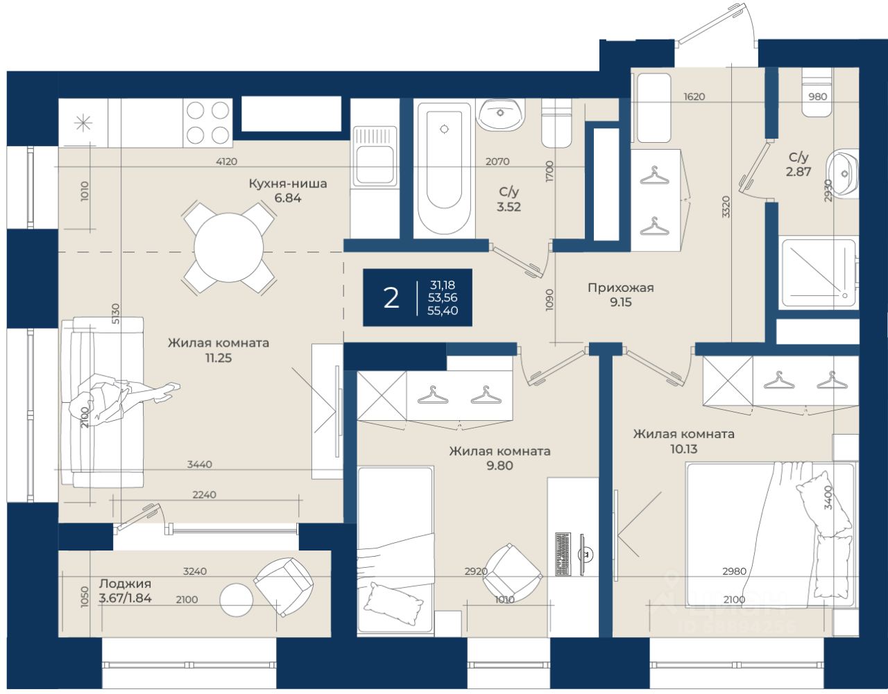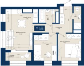 Жилой комплекс "NOVA" Квартира 69 общей площадью 55,4 м2 на 9 этаже.