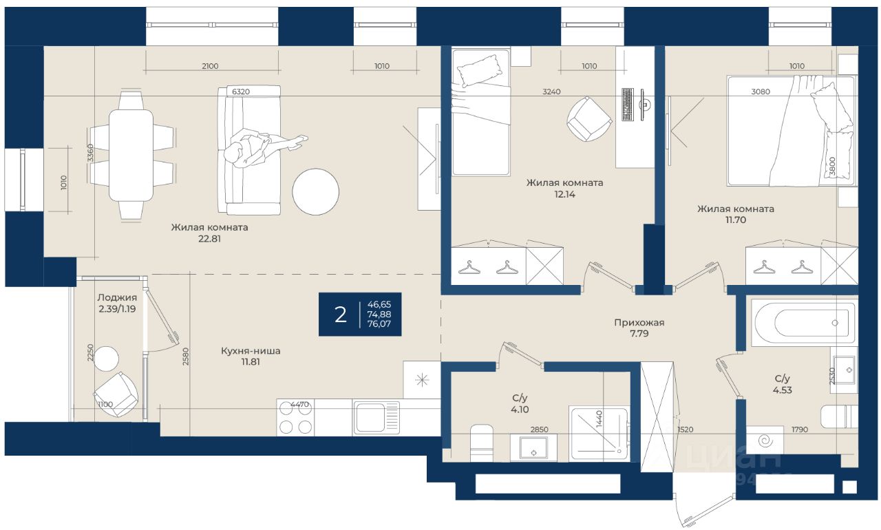 Жилой комплекс "NOVA" Квартира 82 общей площадью 76,07 м2 на 10 этаже.