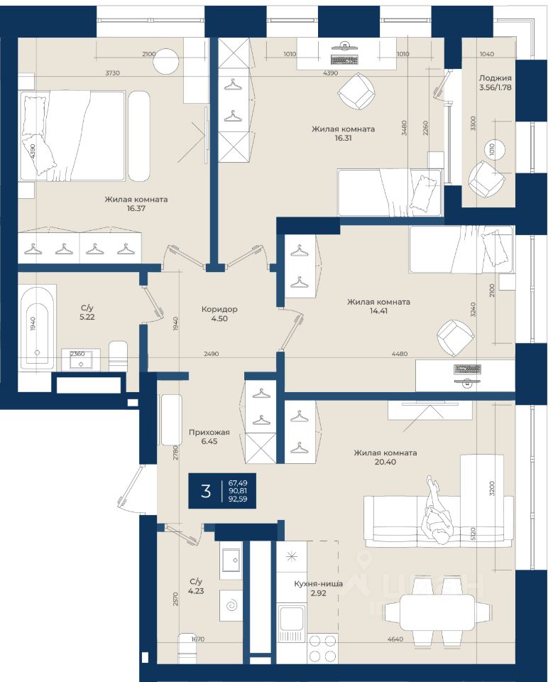 Жилой комплекс "NOVA" Квартира 85 общей площадью 92,59 м2 на 10 этаже.