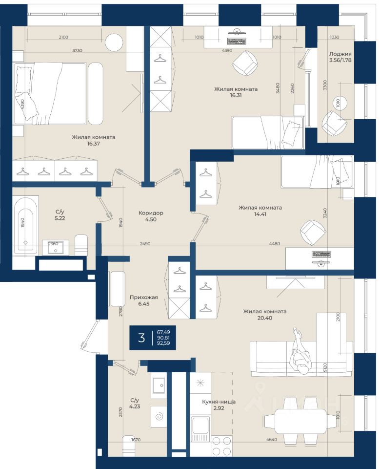 Жилой комплекс "NOVA" Квартира 95 общей площадью 92,59 м2 на 11 этаже.