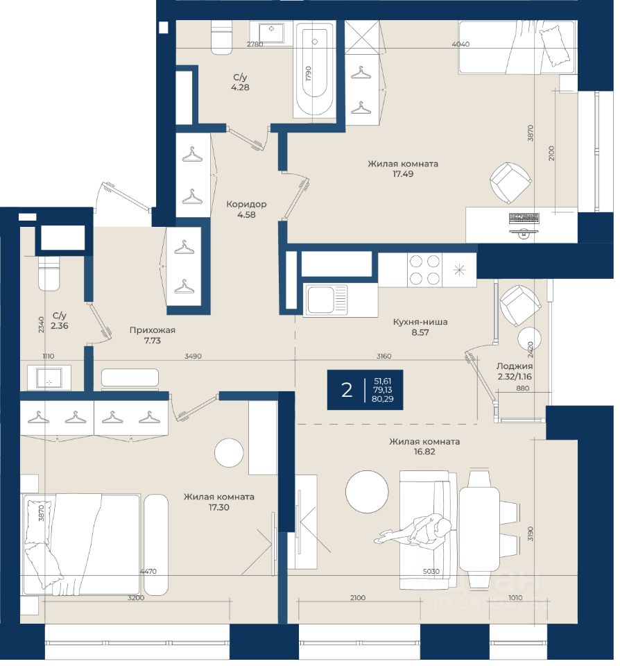 Жилой комплекс "NOVA" Квартира 126 общей площадью 80,29 м2 на 14 этаже.