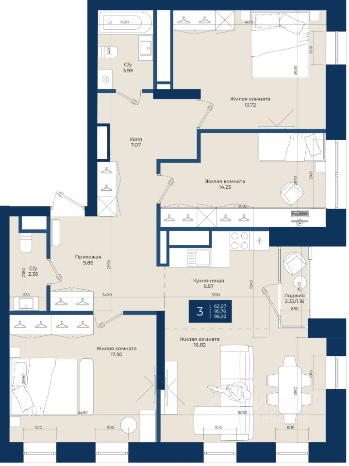 Жилой комплекс "NOVA" Квартира 131 общей площадью 96,92 м2 на 15 этаже.
